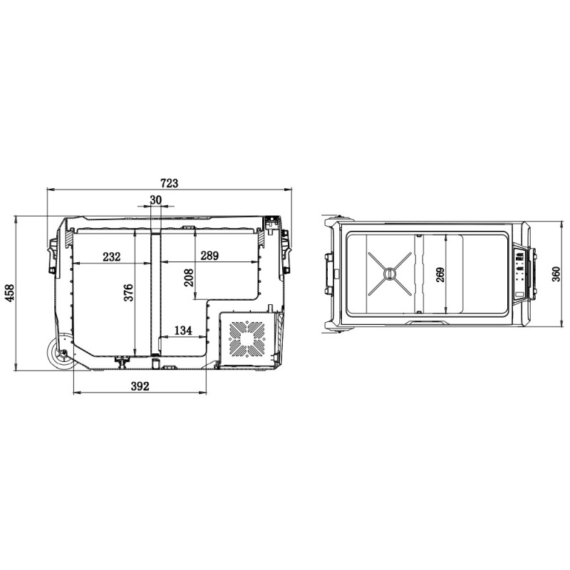 Внутреннее пространство данной модели представлено в виде просторного отсека, разделенного на две части, в каждой из которых Вы можете устанавливать необходимую температуру. Отсеки разделяет специальная перегородка, при изъятии которой, внутри холодильника образуется единый температурный режим. Вы можете с легкостью разместить достаточно большое количество продуктов и ёмкостей с напитками внутри каждого отделения. При открытии автохолодильника срабатывает датчик, за счет чего сразу же включается внутреннее освещение, равномерно распределяющее свет на оба отсека (даже при выключенном питании). Данная модель может работать в трех режимах: охлаждение, заморозка и глубокая заморозка.